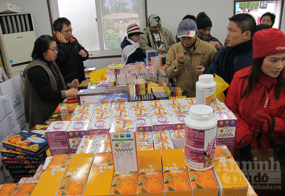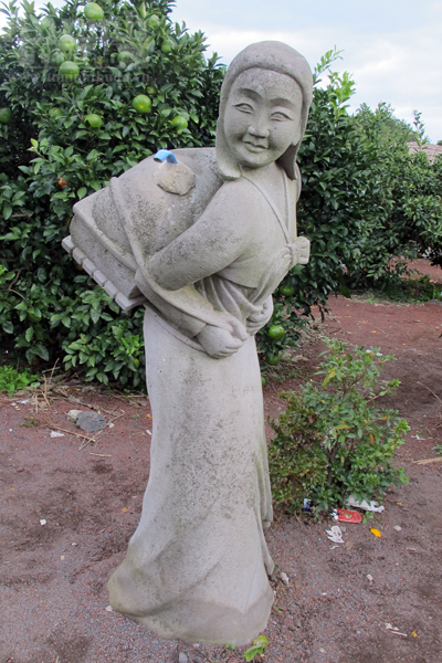 Một bức tượng về người nông dân Hàn Quốc xưa được dựng trong vườn quýt (trái);